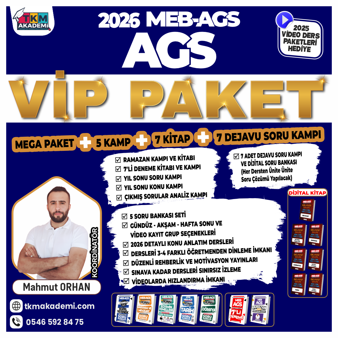 Video Kayıt olarak kursa kayıtlı olan öğretmenlerimiz tüm gruplarda yapılan ders videolarına erişim sağlayabilecek derslere canlı katılamayacaktır.Öğretmen Seçenekleri - AGS: Gruplarda dersler farklı öğretmenler tarafından işlenecektir. Bir dersi bir öğretmenden canlı dinleme şansınız ile birlikte, canlı ders öğretmeniniz ile sinerjiniz uyuşmayabilir ve gayet normaldir. Endişelenmenize gerek yoktur, video kayıttan farklı öğretmenin dersini de dinleyebilirsiniz. Canlı Derslerin Başlangıç ve Bitiş Tarihleri: Kasım 2025 - Sınava Kadar Önemli Uyarı: ✅ Bu paket sadece yukardaki imkanları kapsamaktadır, Başka bir paketin imkanlarını kapsamamaktadır. Paketler içeriğinde yer alan kitap istiyorum seçeneğini tıklayarak kayıt olan kursiyerlerimize kargo gönderimi yapılacak, istemiyorum seçeneğini tıklayan kursiyerlerimize paket içeriğinde yer alan kitapların kargo gönderimi yapılmayacaktır. Kitap seçeneği olarak sunulan yayınlarımızın PDF'leri dijital ortamda paylaşılmaz. Kargo gidecek kişiler kapıda 90-120 ₺ arası sadece kargo bedeli ödeyecektir. ✅ Yapılan dersler kayıt altına alınacaktır. 2026 Sınavına kadar sınırsız izleyebilirsiniz.